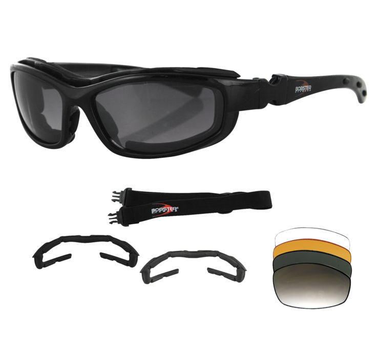 Kit includes four sets of easy-to-change lenses (anti-fog smoked, amber, clear and dual-grade reflective), protective belt case, lens cloth and goggle strap