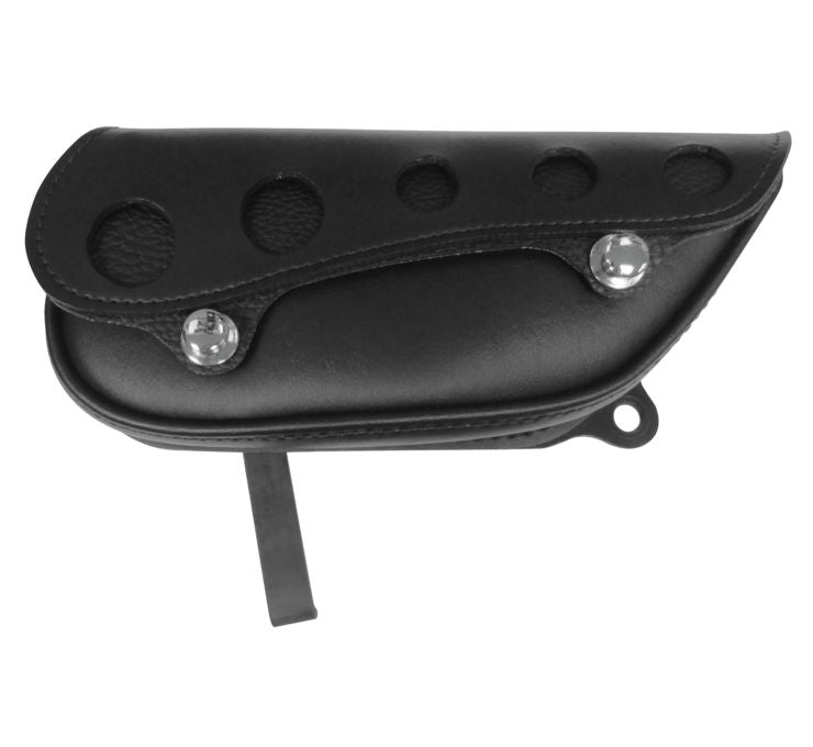 Rigid plastic back, powder-coated steel mounting bracket and stud included. Quick release chrome clasps. Two-tone speed holes match the holes on the Nightster forty-eight belt guard. Large enough to store a pair of gloves and sunglasses or a small lunch. Fits all 92–16 Sportster models with a belt drive.